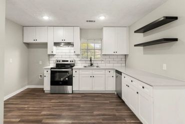 Fully remodeled kitchen that opens to the living room with new cabinets, new hood, new faucet & new quartz Countertops.
